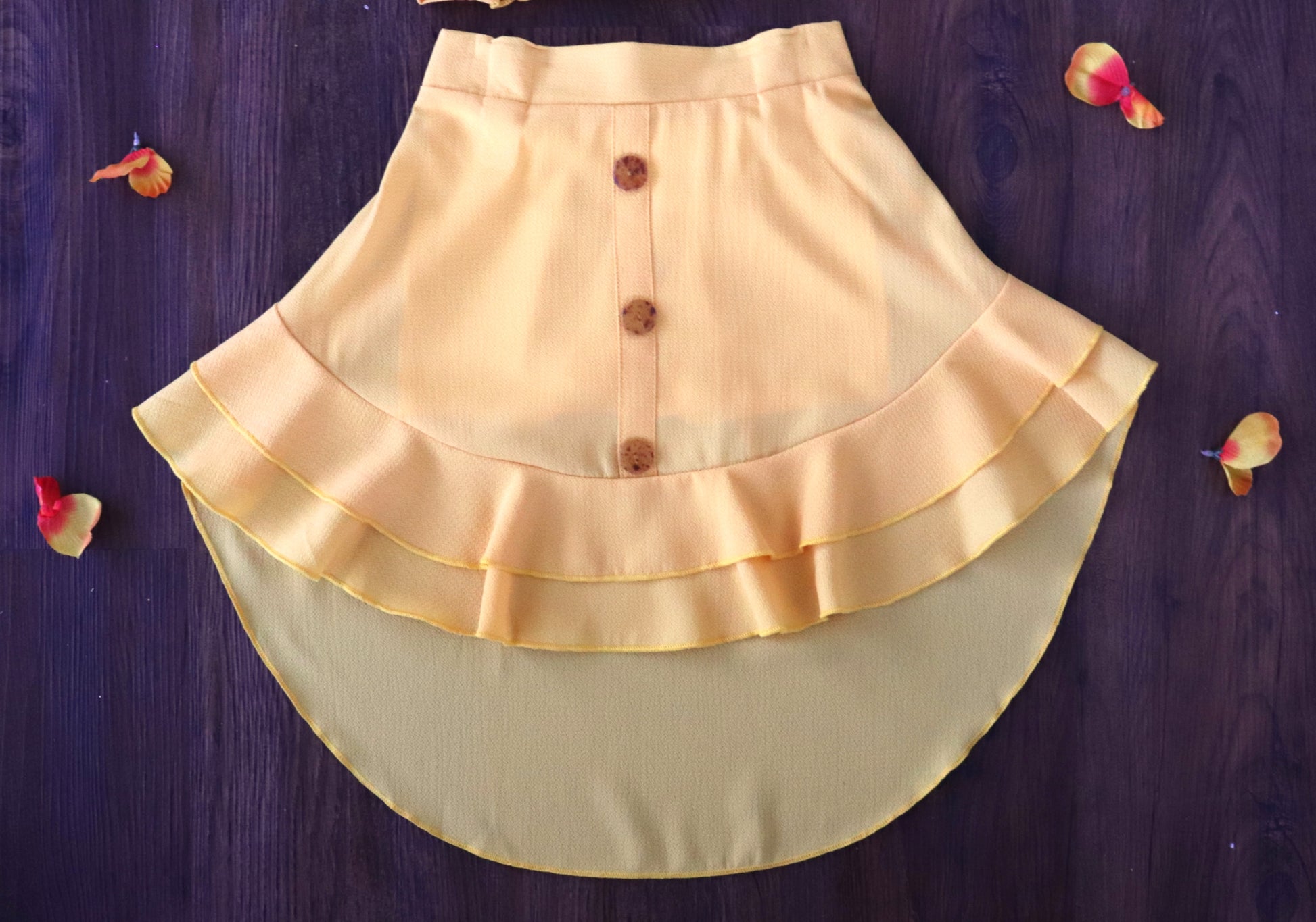 The ruffle set comes with a skirt and top in mustard yellow. The top has flutter ruffles across the shoulder and chest along with buttons that match the skirt as well. The skirt is lower in the back for full coverage. This set runs a little small so please size up.